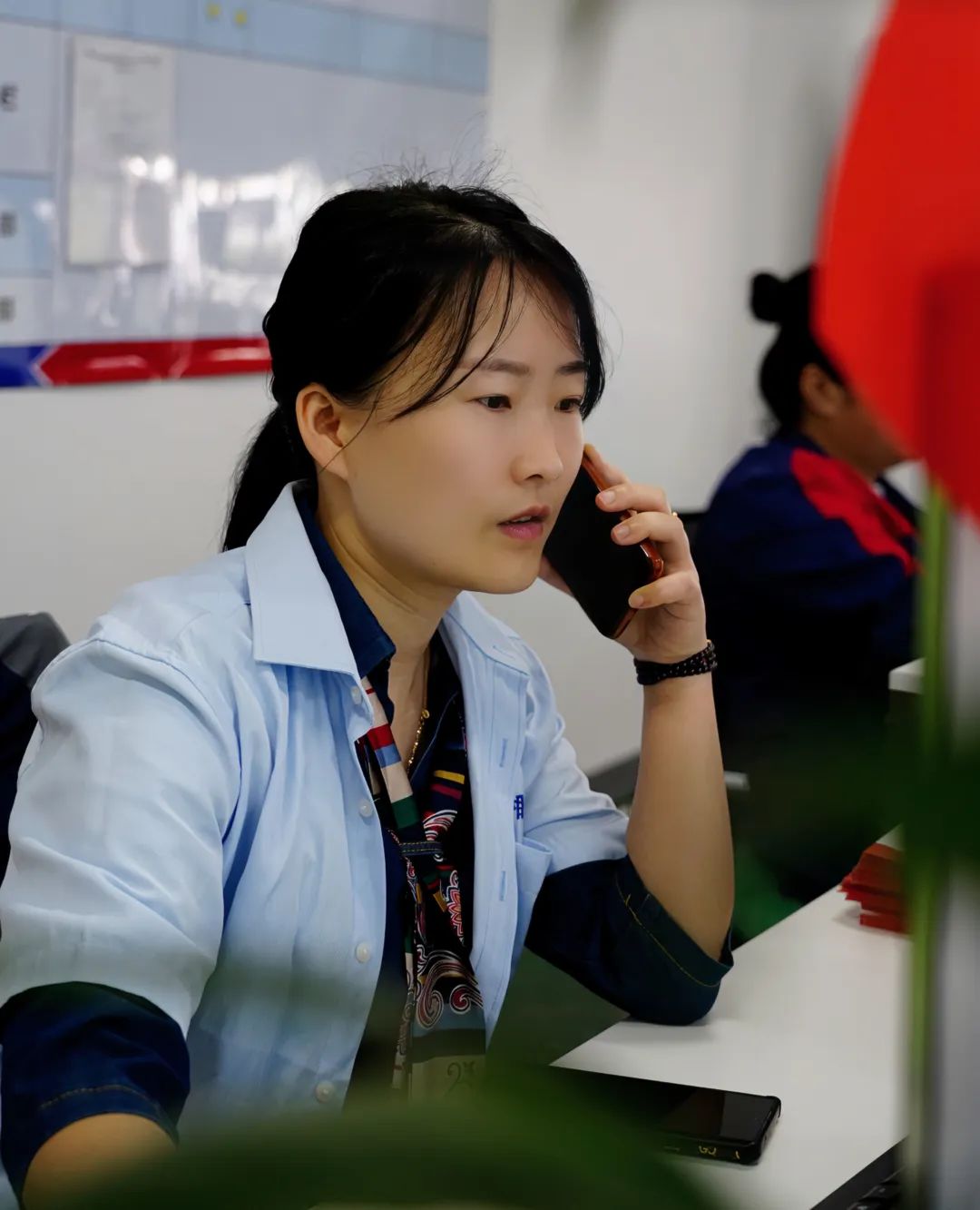 ▲楊祁矞正在與同事協(xié)商解決客戶問題