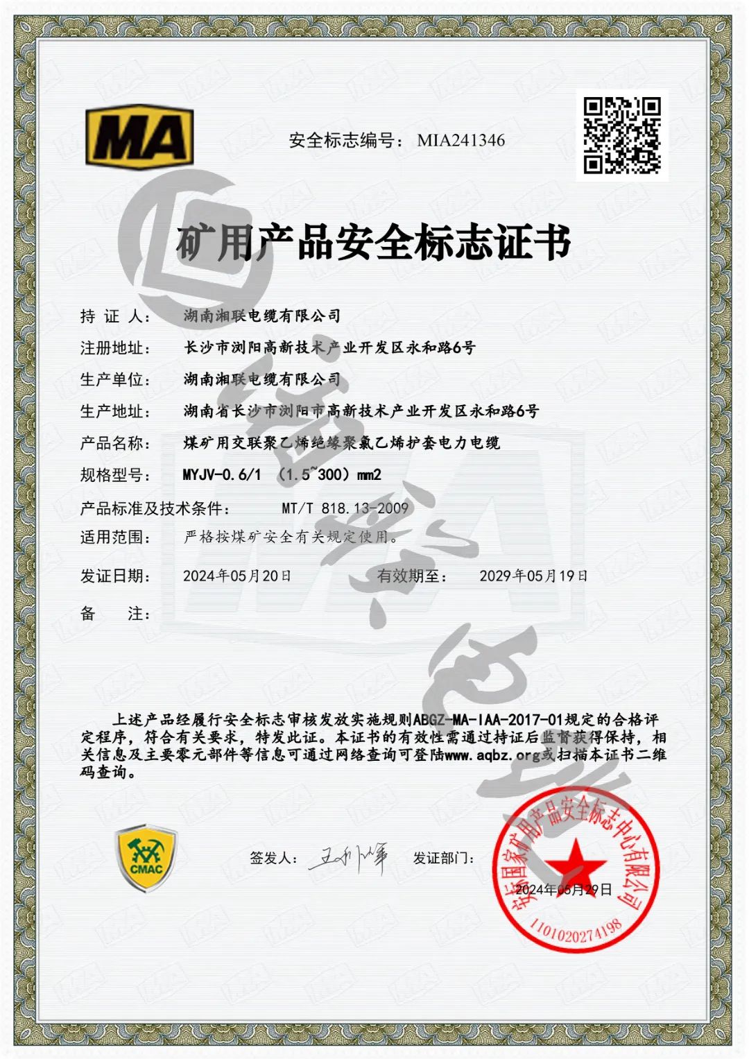 近日,湖南湘聯(lián)電纜有限公司成功取得安標(biāo)國家礦用產(chǎn)品安全標(biāo)志中心頒發(fā)MVV-0.6/1(1.5~300)mm2煤礦用聚氯乙烯絕緣聚氯乙烯護套電力電纜、MYJV-8.7/10(25~300)mm2煤礦用交聯(lián)聚乙烯絕緣聚氯乙烯護套電力電纜等六個產(chǎn)品的礦用產(chǎn)品安全標(biāo)志證書。