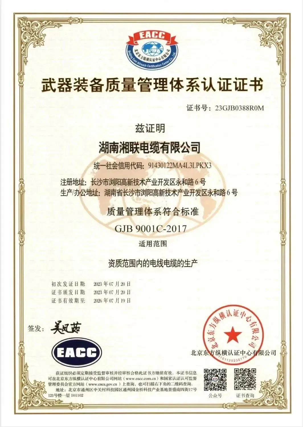 7月20日,湖南湘聯(lián)電纜有限公司順利通過國軍標質量管理體系認證,獲得《武器裝備質量管理體系認證證書》,質量管理體系符合:GJB9001C-2017標準。