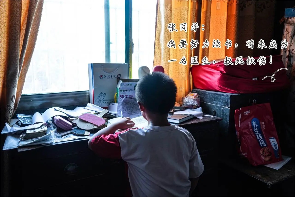 張同學:10歲,母親去世,父親患腎病綜合癥,無法勞動,需定期前往長沙醫(yī)院就診復查,家中還有年邁的奶奶,需要照顧贍養(yǎng)。盡管家庭經(jīng)濟條件遇到困難,但其父依然十分重視教育,希望孩子能夠通過讀書改變命運。